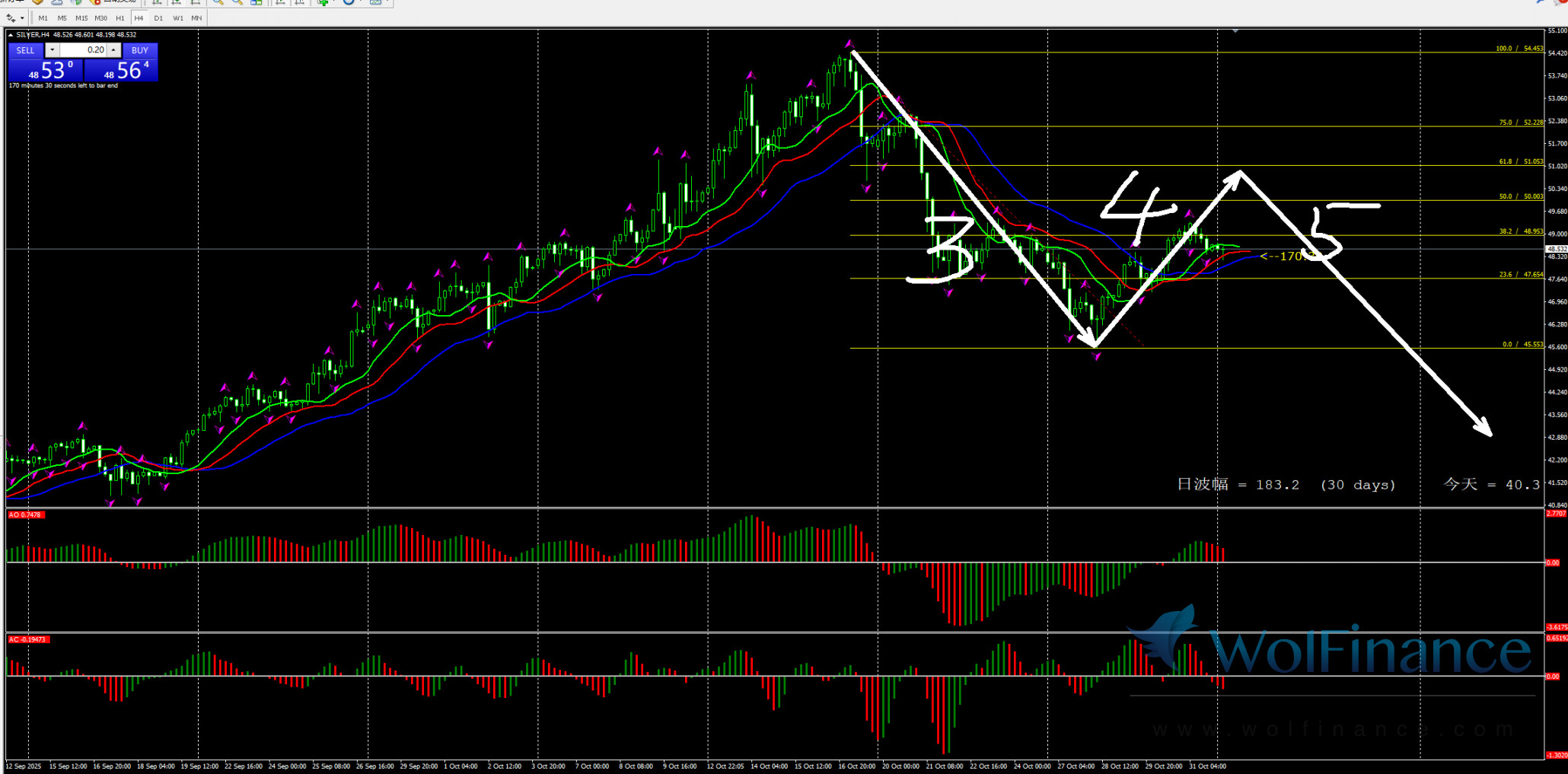 日线图目前处在4浪之中,关注4浪的行情走势。压力倾向在日线图52.70一线附近;支撑倾向在日线图50%(45.80)和61.8%(43.80)一线附近;四小时行情处在4浪走势;并关注上方压力52.70一线附近;1小时图AO零轴下红色;AC零下红色,行情在小时图356日线之下运行;小时图关注52.70附近的压力;所以今日关注1小时图震荡行情。